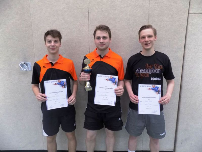 In den Einzeln der Herren gingen Hauke, Arne, Dietmar, Thomas, Vincent, Dennis, Tarek und Jan-Merten an den Start. In zwei 4er-Gruppen wurden zunächst die Top 4 ausgespielt. Arne, Vincent, Dennis und Jan-Merten konnten sich dabei durchsetzen und in die Halbfinale einziehen. Nachdem sich Dennis gegen Vincent durchsetzen konnte, traf er im Finale auf Jan-Merten, der zuvor gegen den krankheitsbedingt mehr als angeschlagenen Arne gewonnen hatte. In einem packenden Finale konnte letztlich Jan-Merten das Spiel für sich entscheiden. Damit hat er die Vereinsmeisterschaften dreimal in Folge gewonnen, sodass er den Wanderpokal nun endgültig mit nach Hause nehmen darf. Dennis belegte den 2. Platz, gefolgt von Vincent auf dem 3. Platz.
